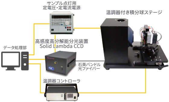 コーティング剤は硫酸バリウムで、自己吸収光源として2Wハロゲンランプが付属しております。写真は6インチですが他のサイズも選べます。温調器を使用しての耐温度特性や、印加電圧を制御して電気特性の評価を行います。システム構成